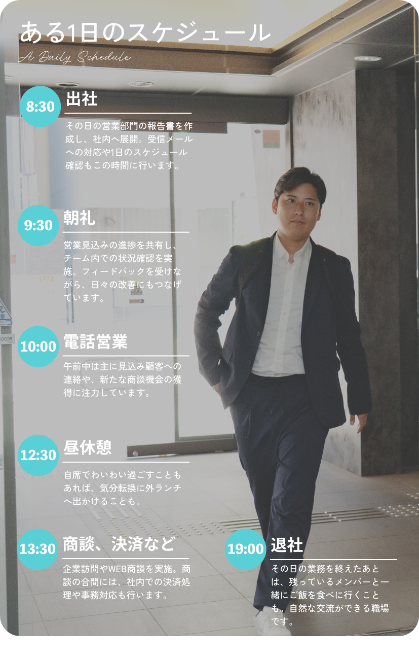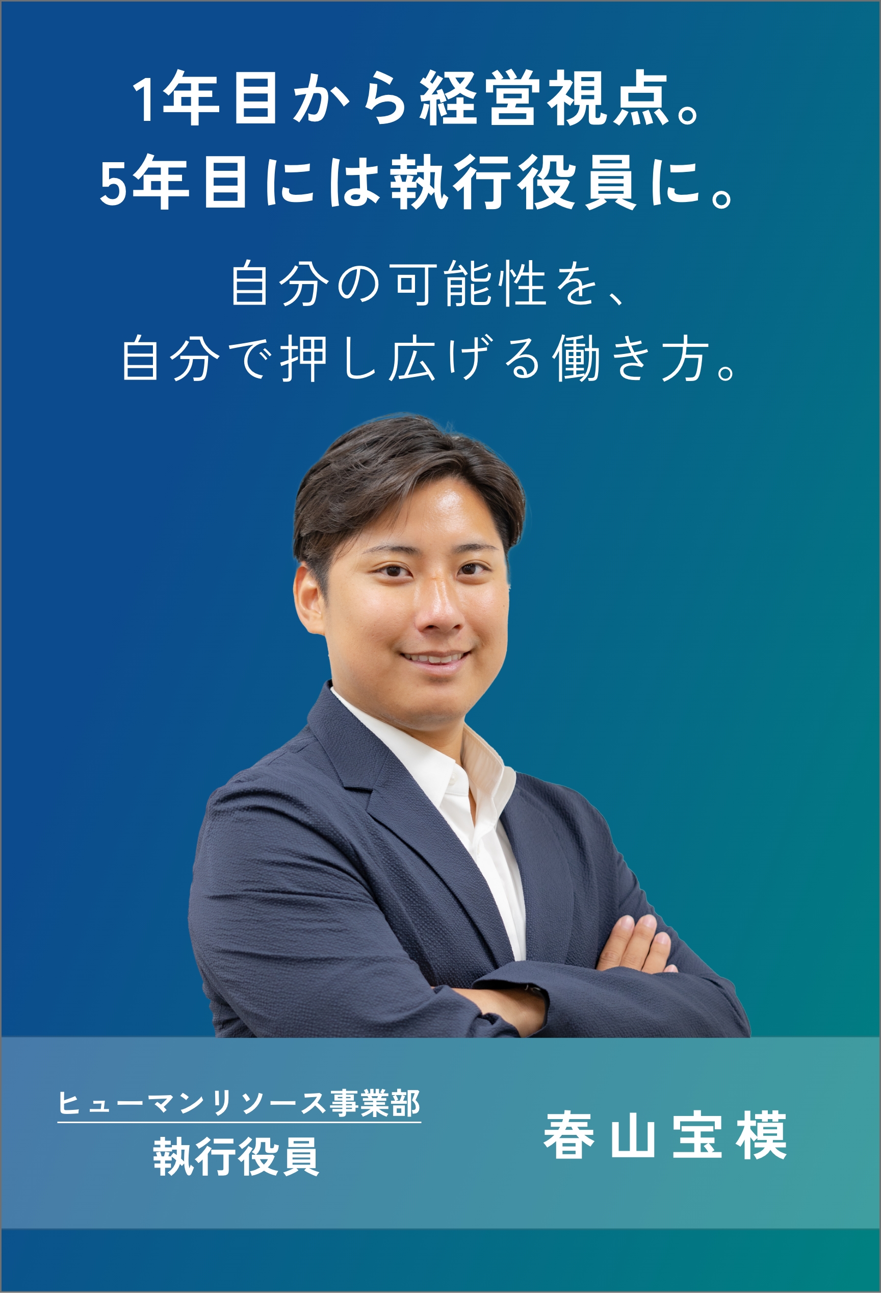 現在は、経営計画の策定、人材・営業組織のマネジメントなどを通じて、経営視点と現場感覚の両方を活かしながら、組織の成長に貢献しています。